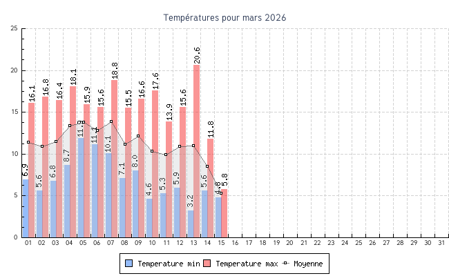 | 01 | 6.9 °C | 16.1 °C | 11.4 °C | 5.7 km/h (24.1 km/h) | NE |
