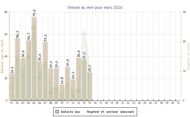 | min | max | moy | Vitesse (rafales) | Secteur | ||